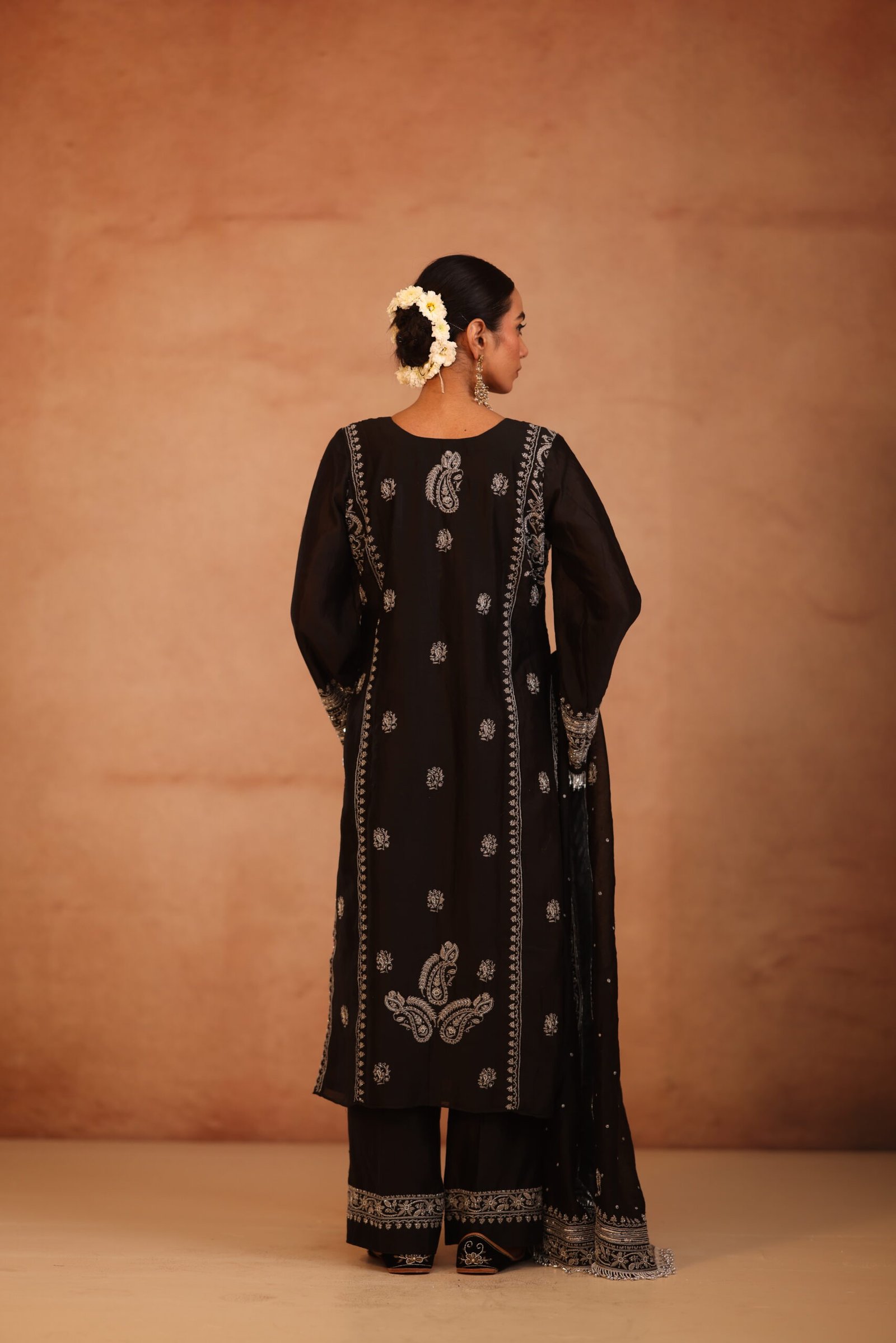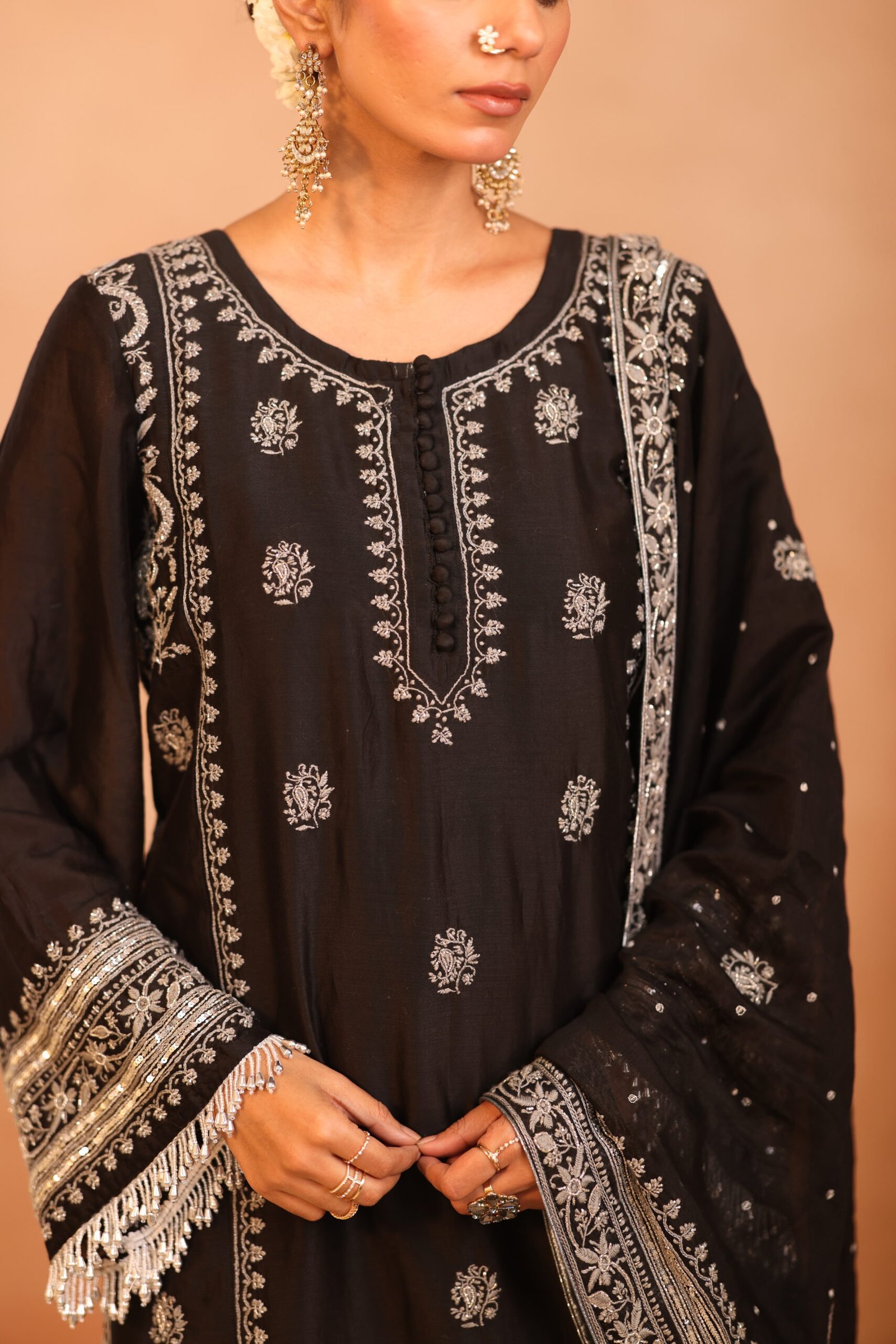 A bold expression of elegance, this black Noori suit is enhanced with refined silver highlights that add a striking shimmer. The rich tone paired with subtle detailing creates a perfect balance of glamour and sophistication, ideal for evening and festive occasions.
