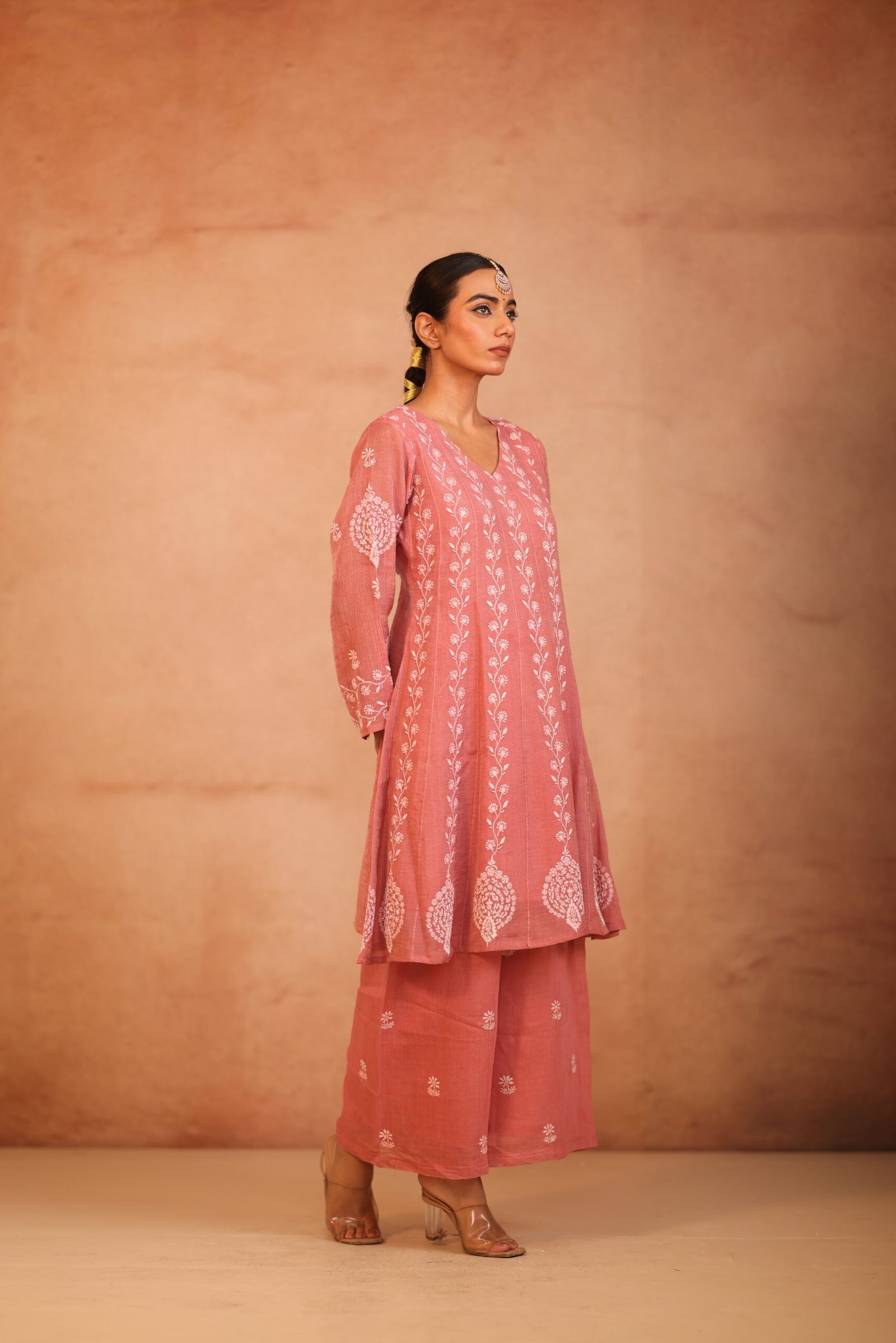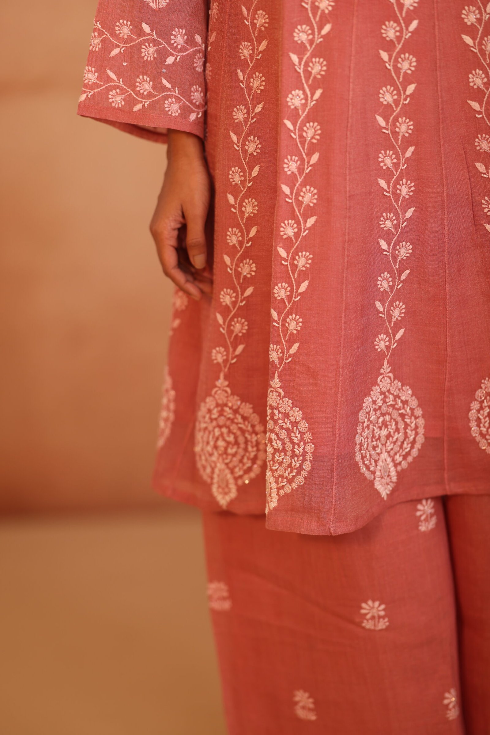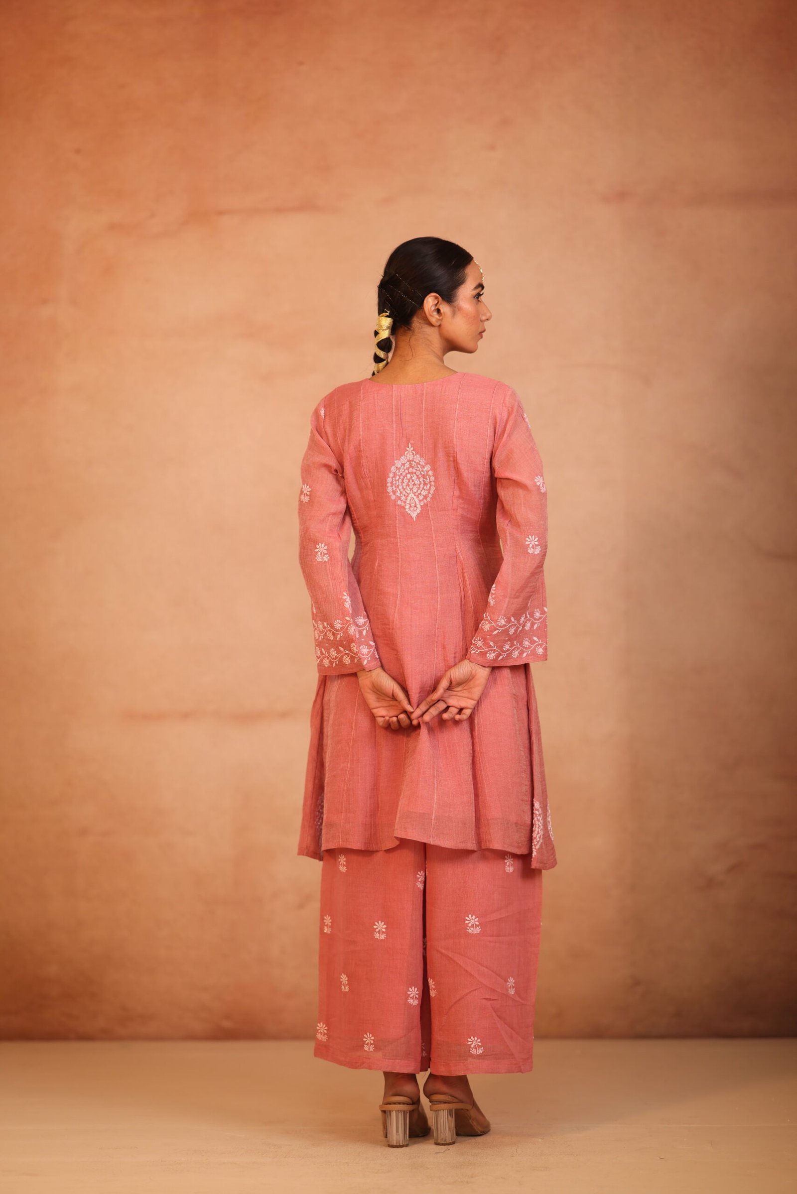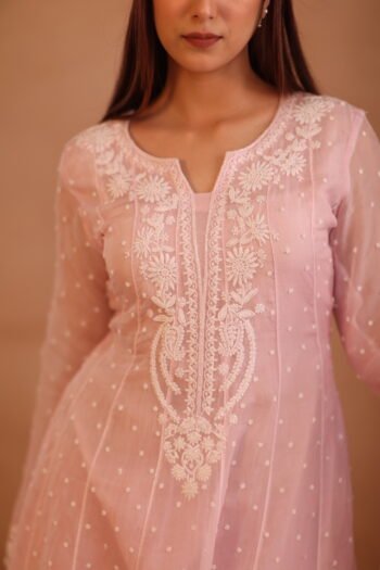 A soft peach shirt beautifully adorned with delicate chikankari embroidery and subtle embellishments for an elegant finish. Lightweight and refined, it’s perfect for both festive and everyday sophistication.