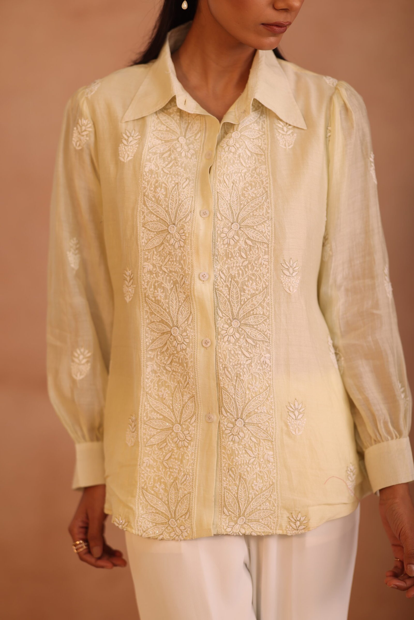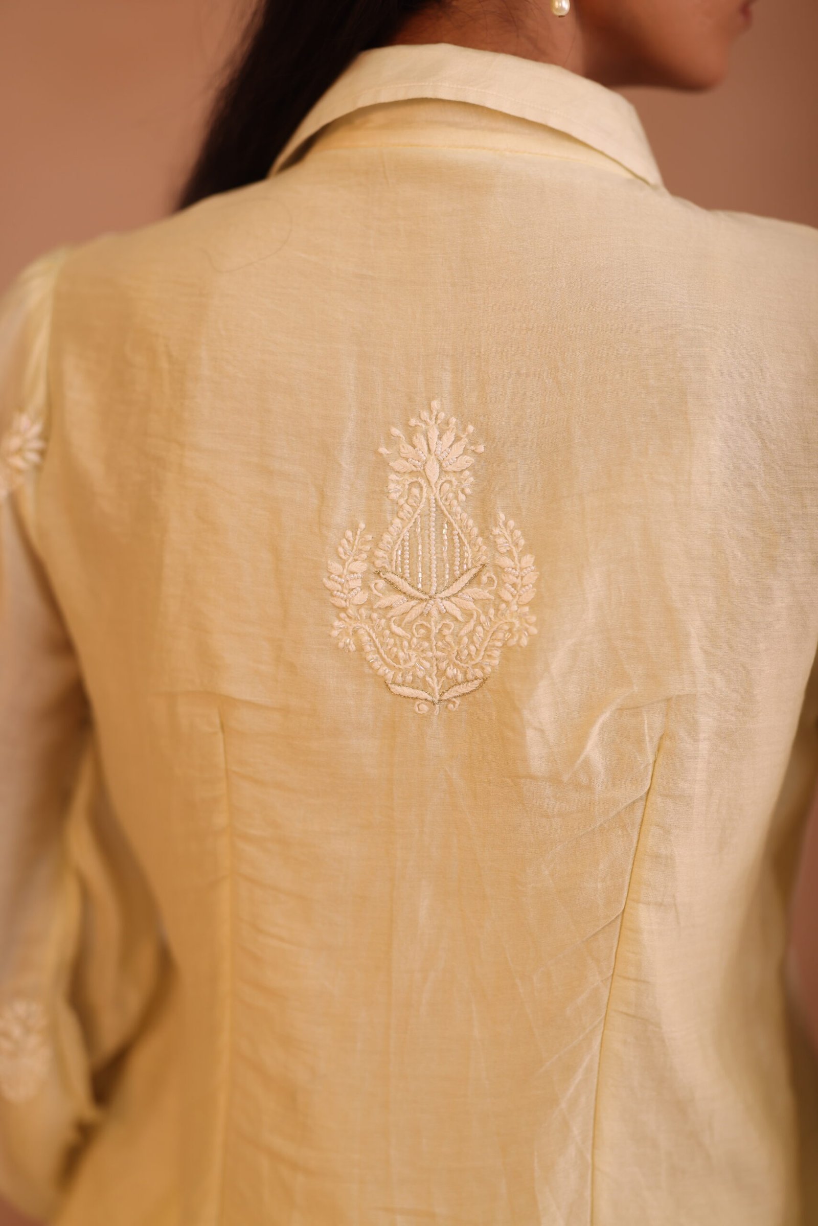 A soft peach shirt beautifully adorned with delicate chikankari embroidery and subtle embellishments for an elegant finish. Lightweight and refined, it’s perfect for both festive and everyday sophistication.