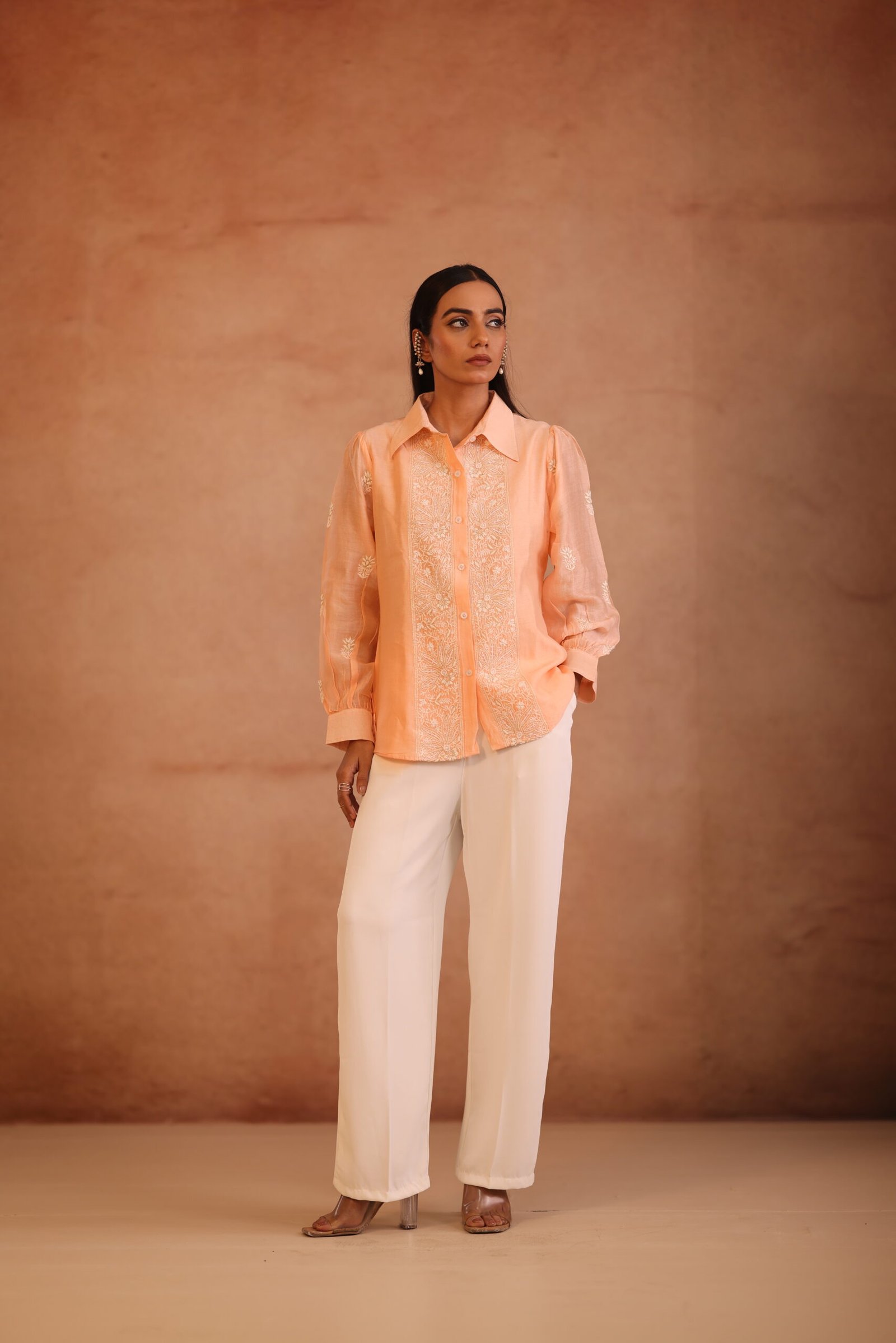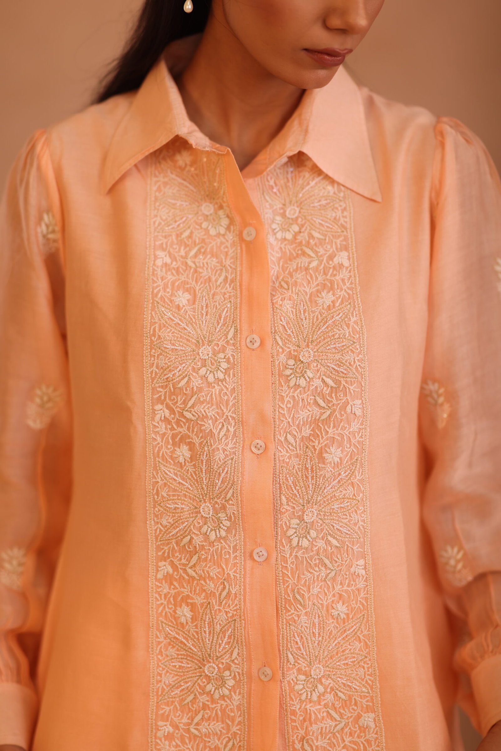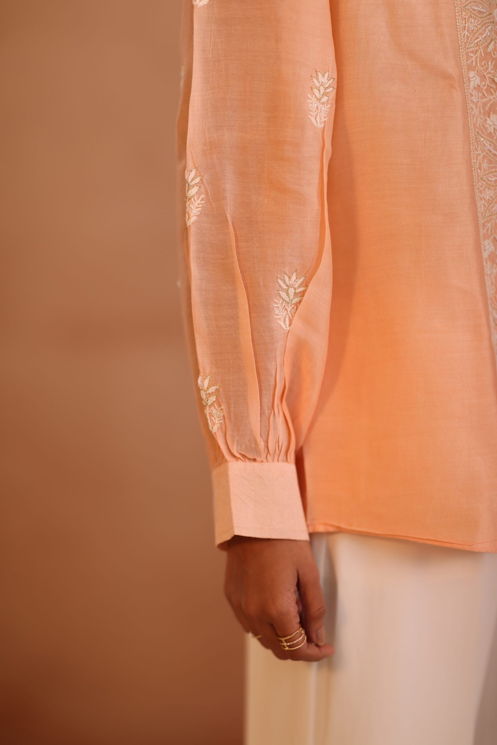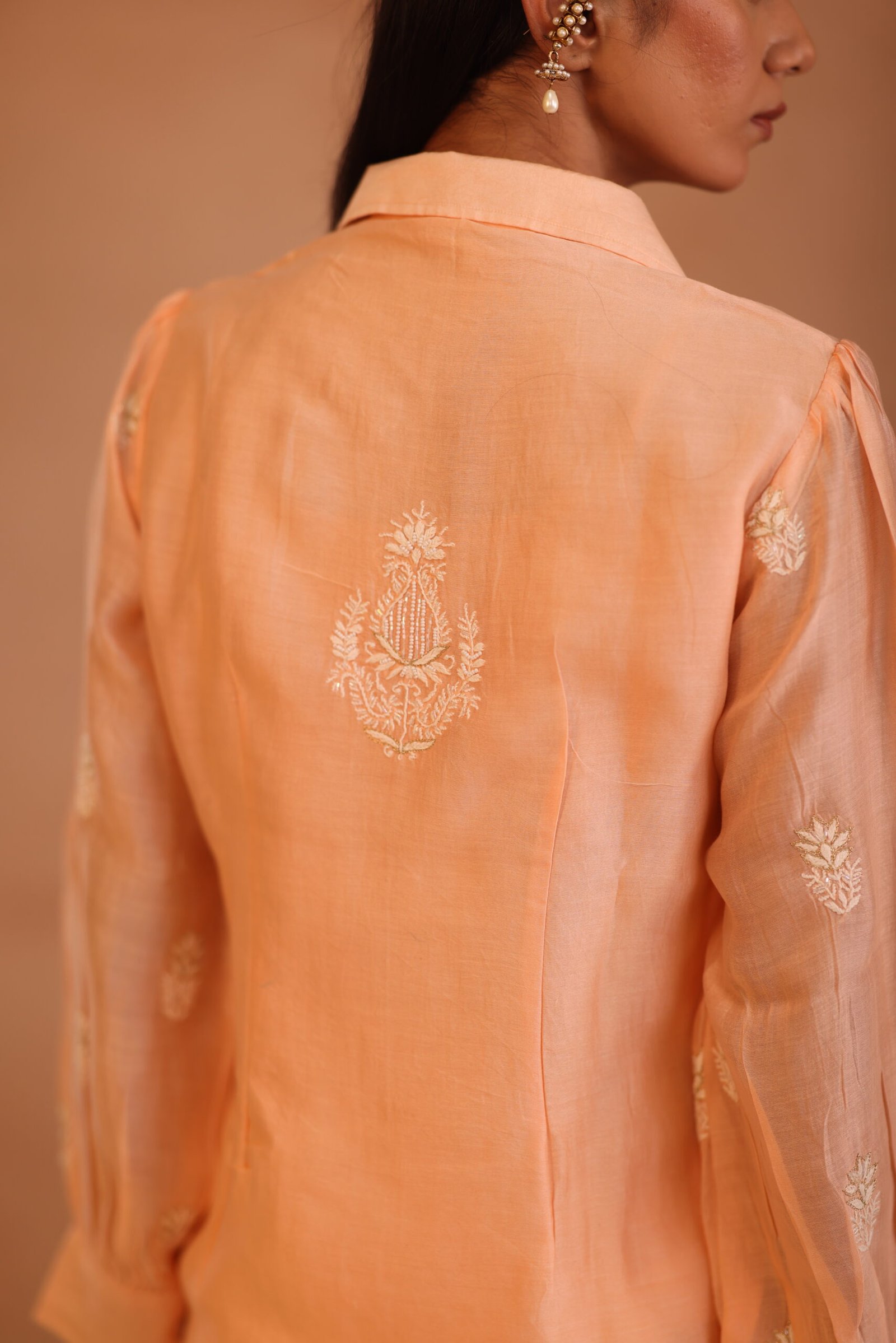 A soft peach shirt beautifully adorned with delicate chikankari embroidery and subtle embellishments for an elegant finish. Lightweight and refined, it’s perfect for both festive and everyday sophistication.
