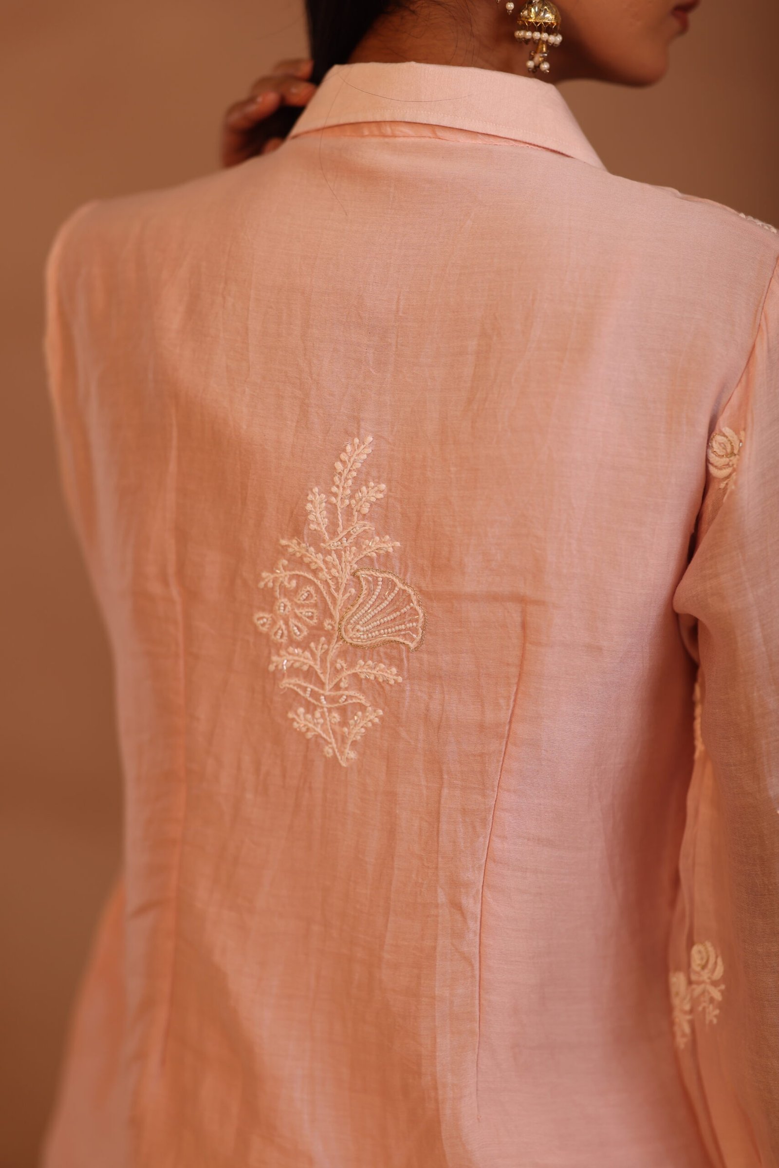 A soft peach shirt beautifully adorned with delicate chikankari embroidery and subtle embellishments for an elegant finish. Lightweight and refined, it’s perfect for both festive and everyday sophistication.