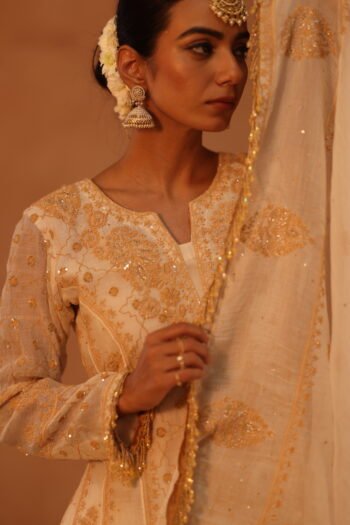 Opulent and refined, this beige Anarkali is a true expression of luxury. Adorned with delicate highlights that catch the light with every movement, it exudes effortless grace and sophistication. The fluid silhouette enhances its regal charm, making it a perfect choice for elegant soirées and intimate celebrations.