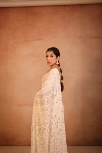 Experience refined elegance with this beautifully crafted georgette saree, featuring intricate heavy chikankari work enhanced with delicate embellishments. The detailed embroidery reflects timeless craftsmanship, while the subtle shimmer adds a touch of festive charm.