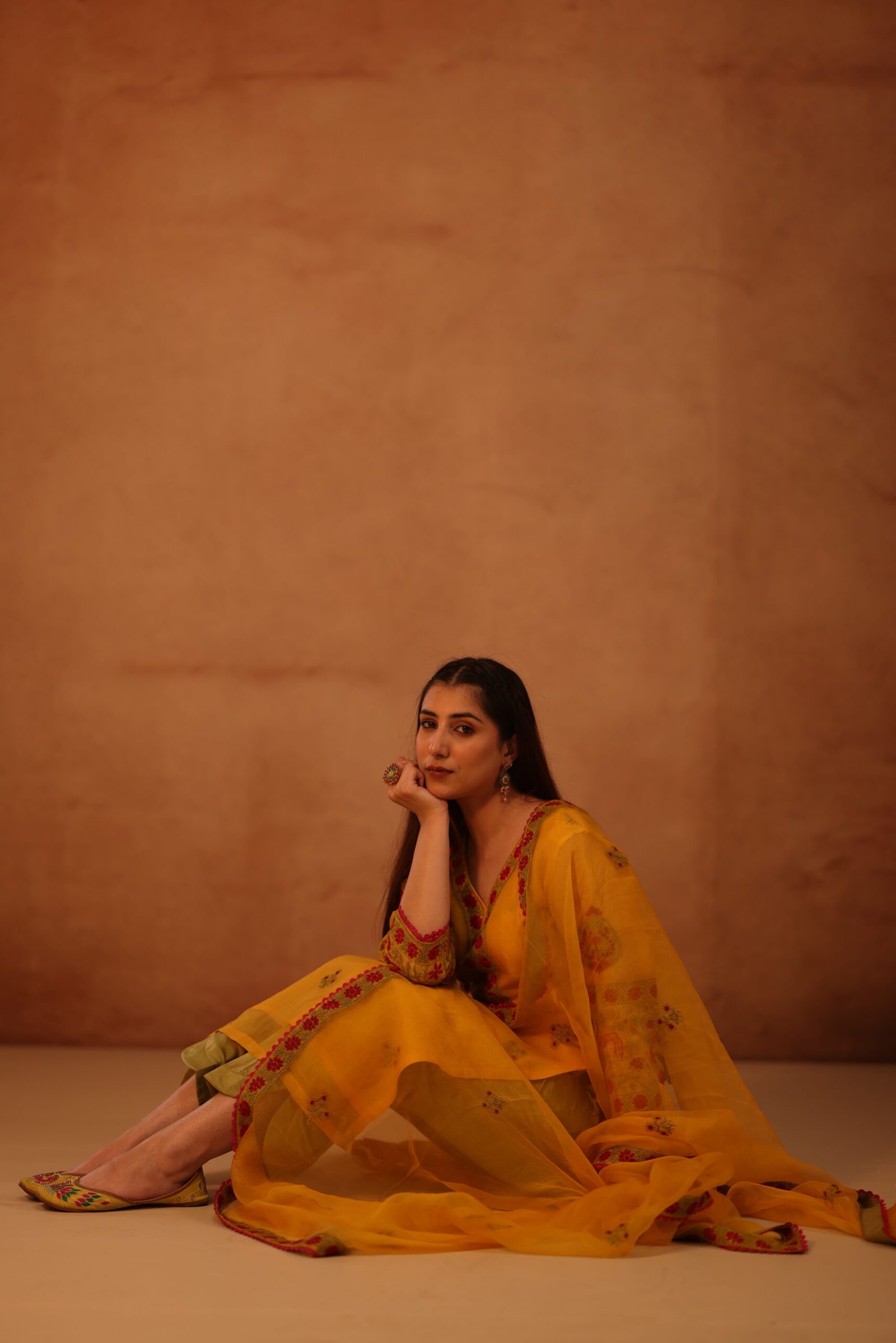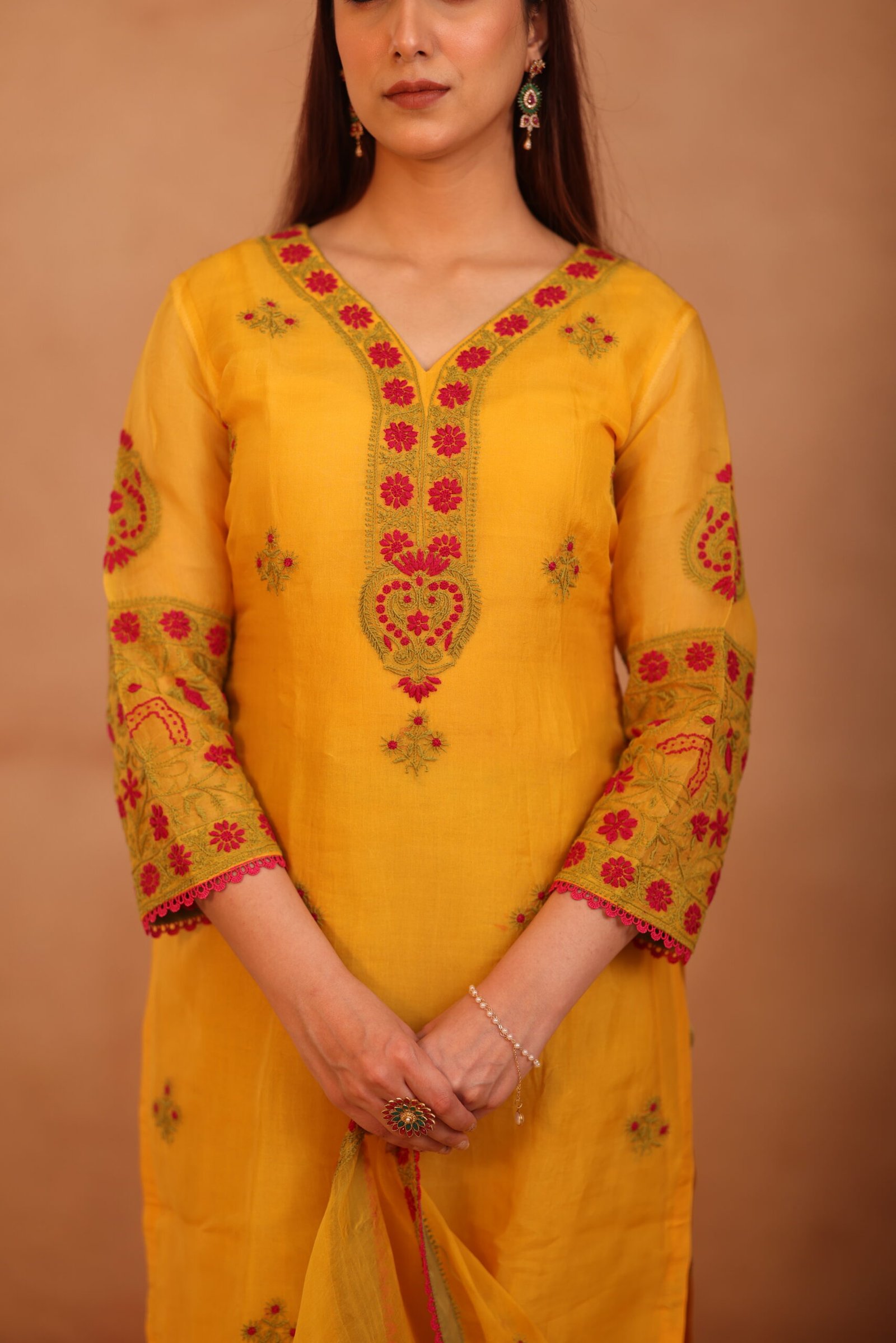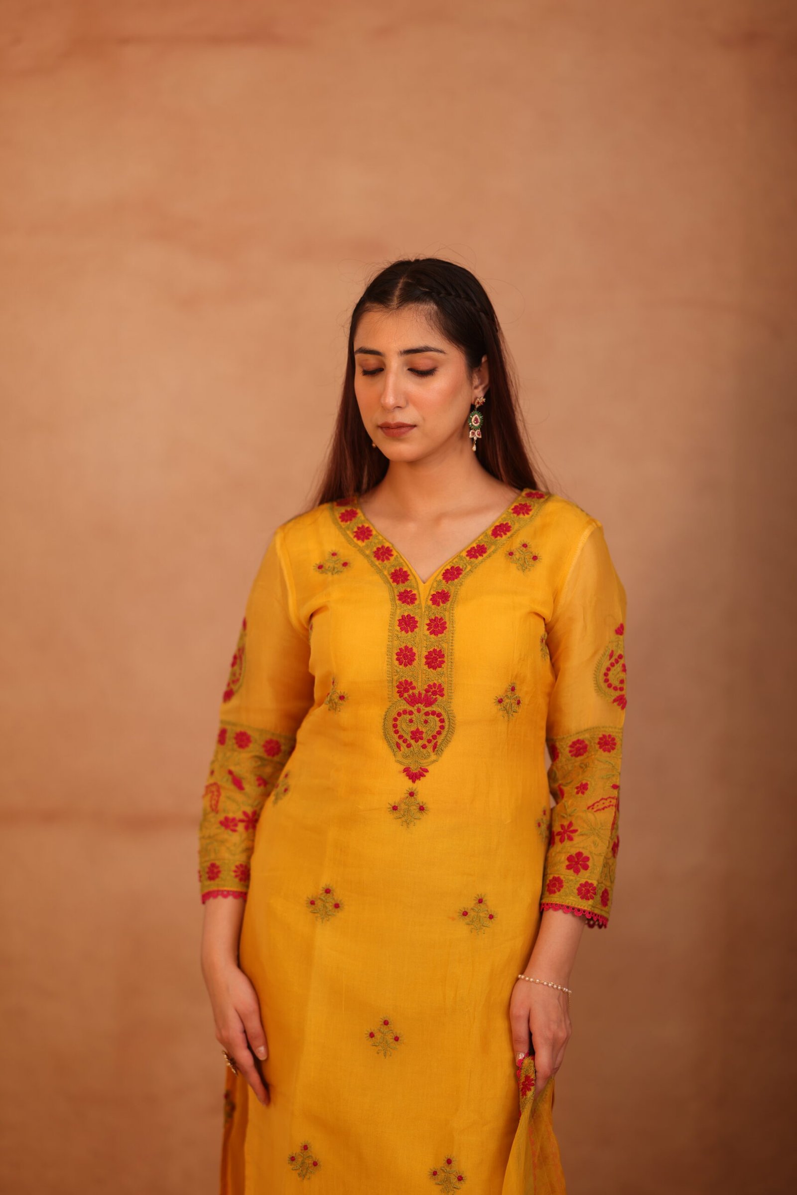 A graceful mustard organza suit featuring vibrant, intricate chikankari with beautiful pink and green colour threads that adds a lively and elegant touch. Lightweight and sheer, its perfect for festive gatherings and special occasions.