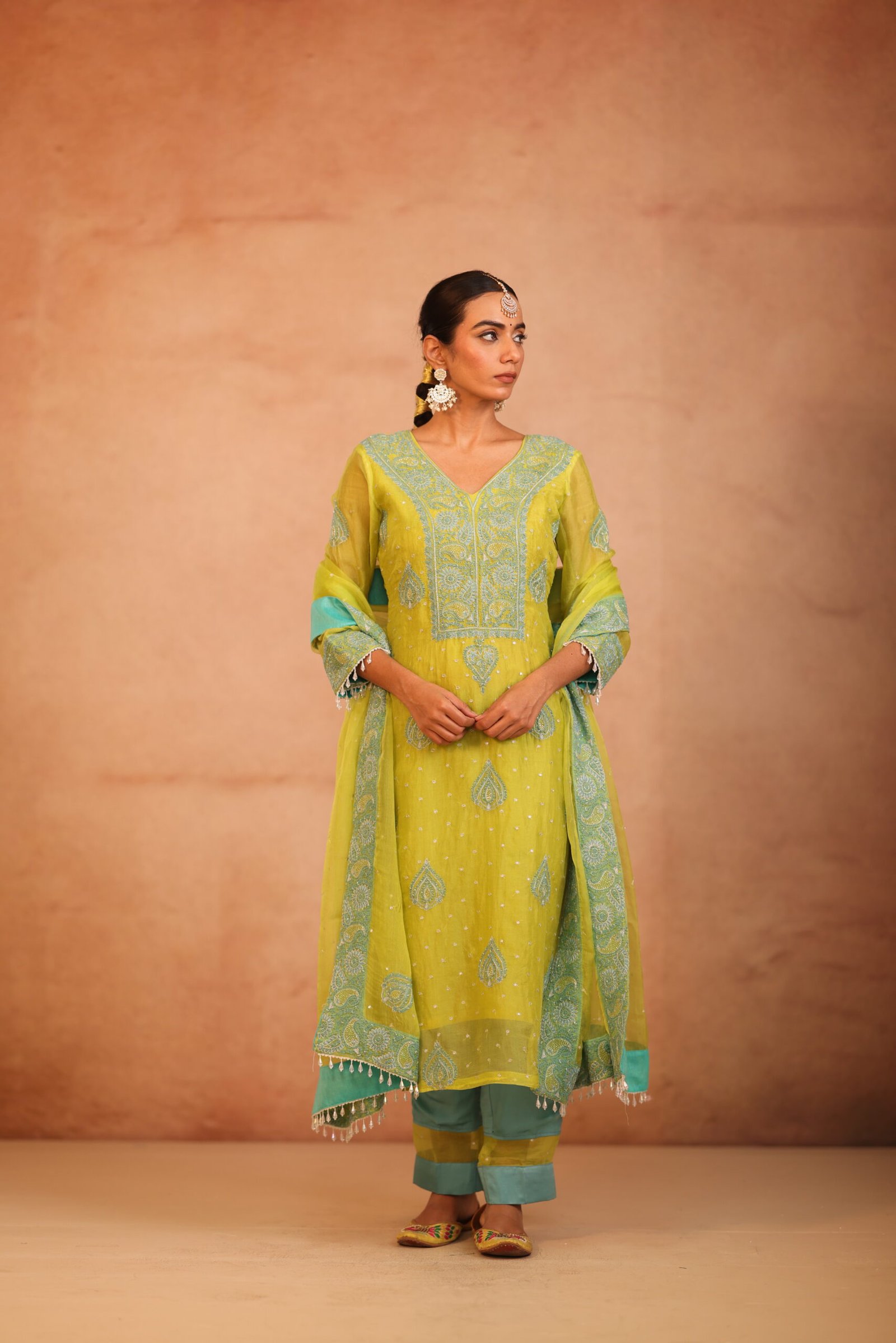 A graceful mustard organza suit featuring vibrant, intricate chikankari with beautiful pink and green colour threads that adds a lively and elegant touch. Lightweight and sheer, its perfect for festive gatherings and special occasions.