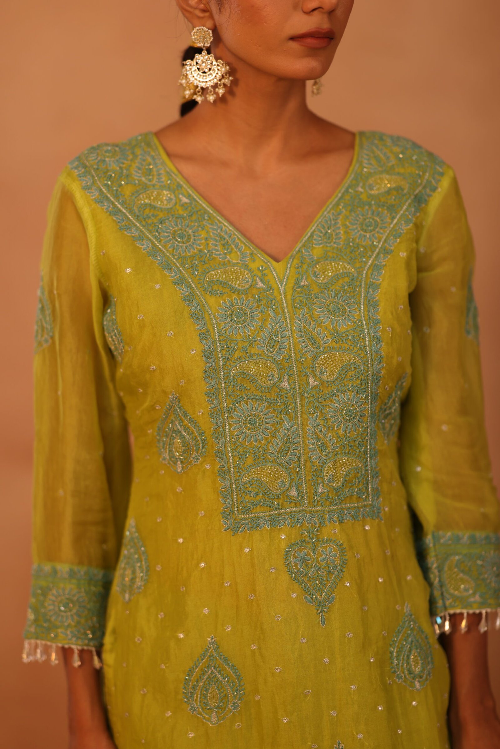A soft peach shirt beautifully adorned with delicate chikankari embroidery and subtle embellishments for an elegant finish. Lightweight and refined, it’s perfect for both festive and everyday sophistication.