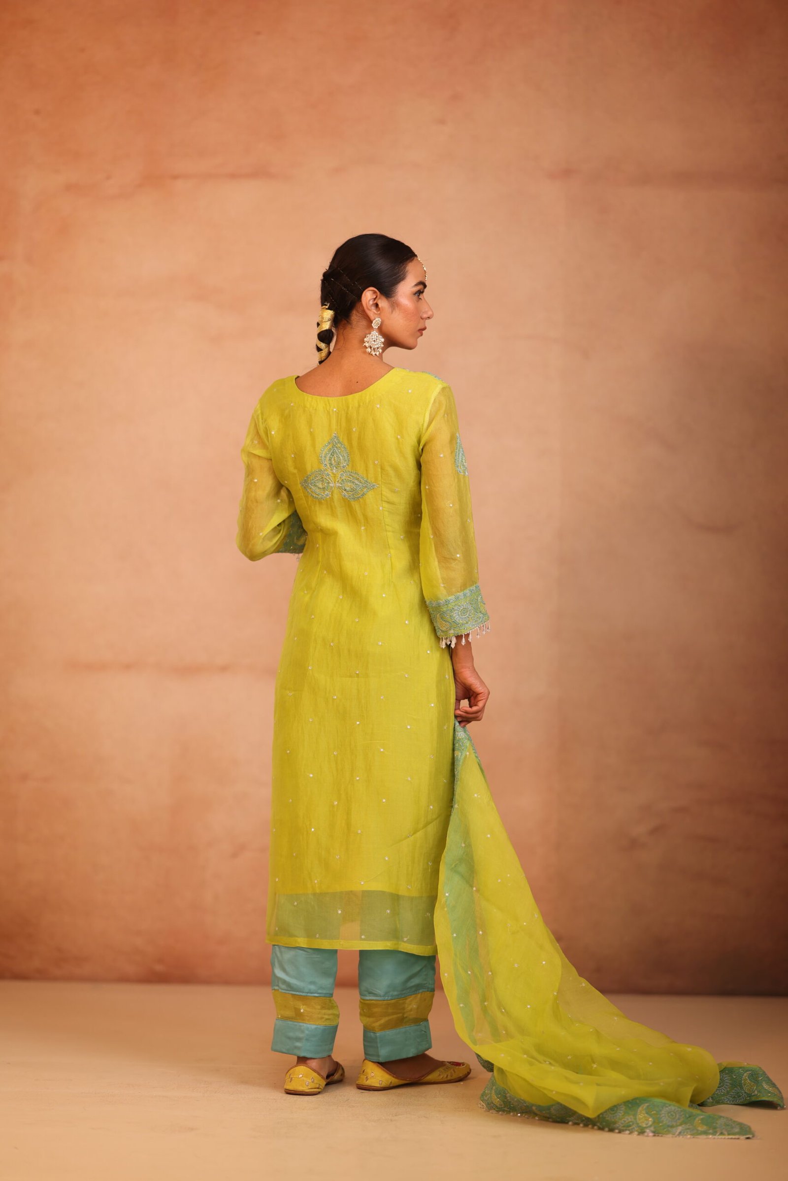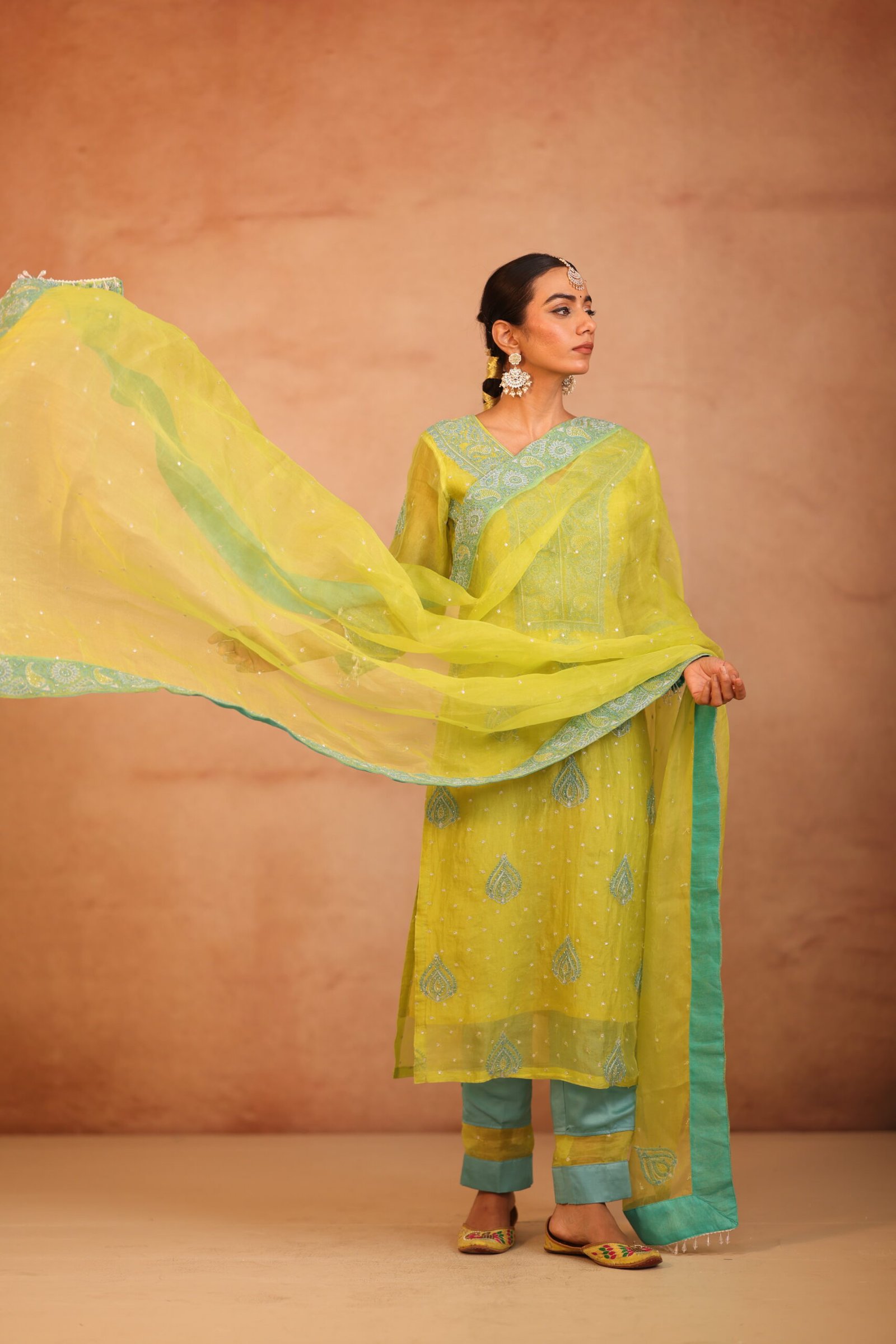 A vibrant neon green organza suit accentuated with delicate zari highlights, adding a subtle shimmer to its modern appeal. The lightweight sheer fabric brings elegance and freshness, making it a standout choice for festive and special occasions.