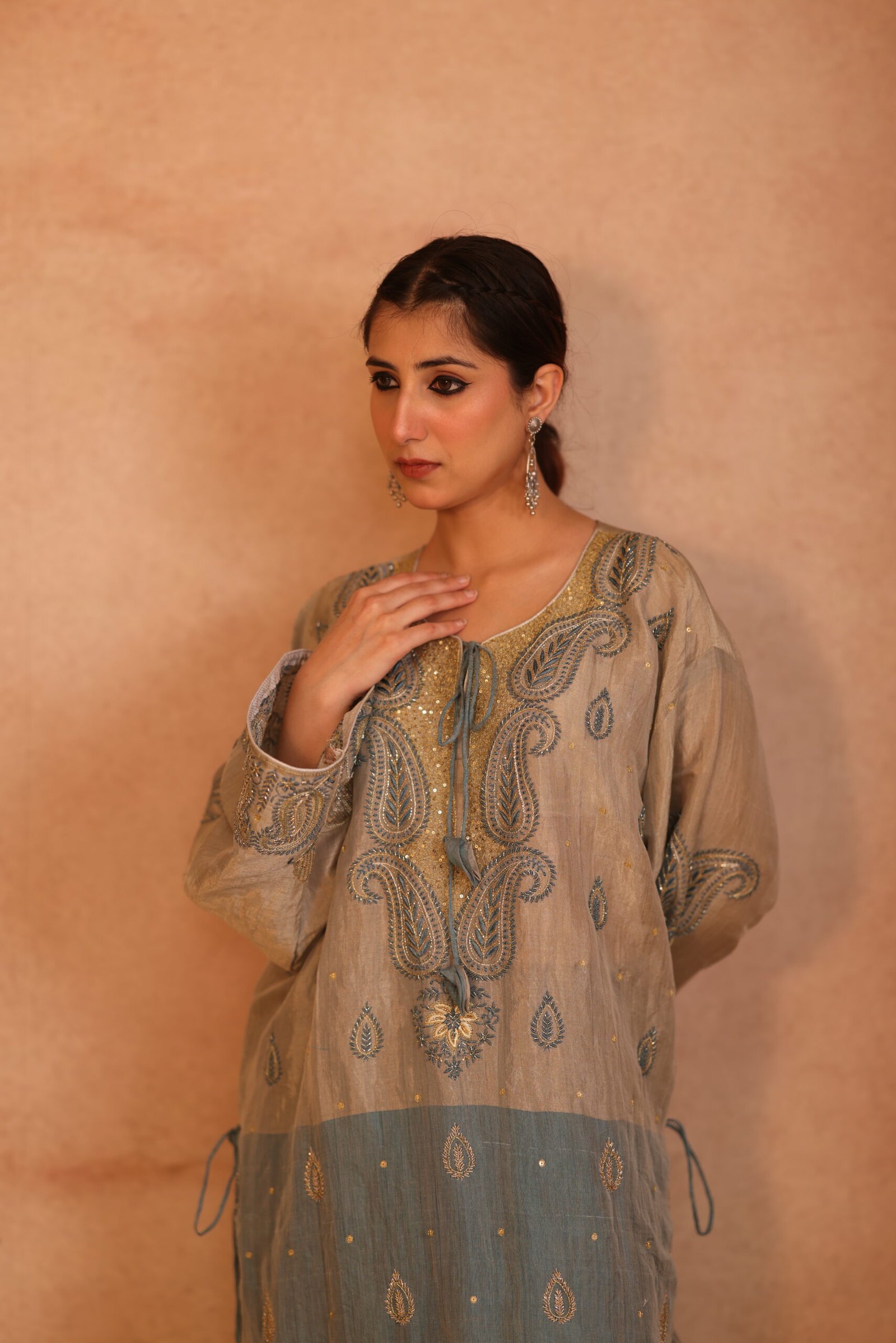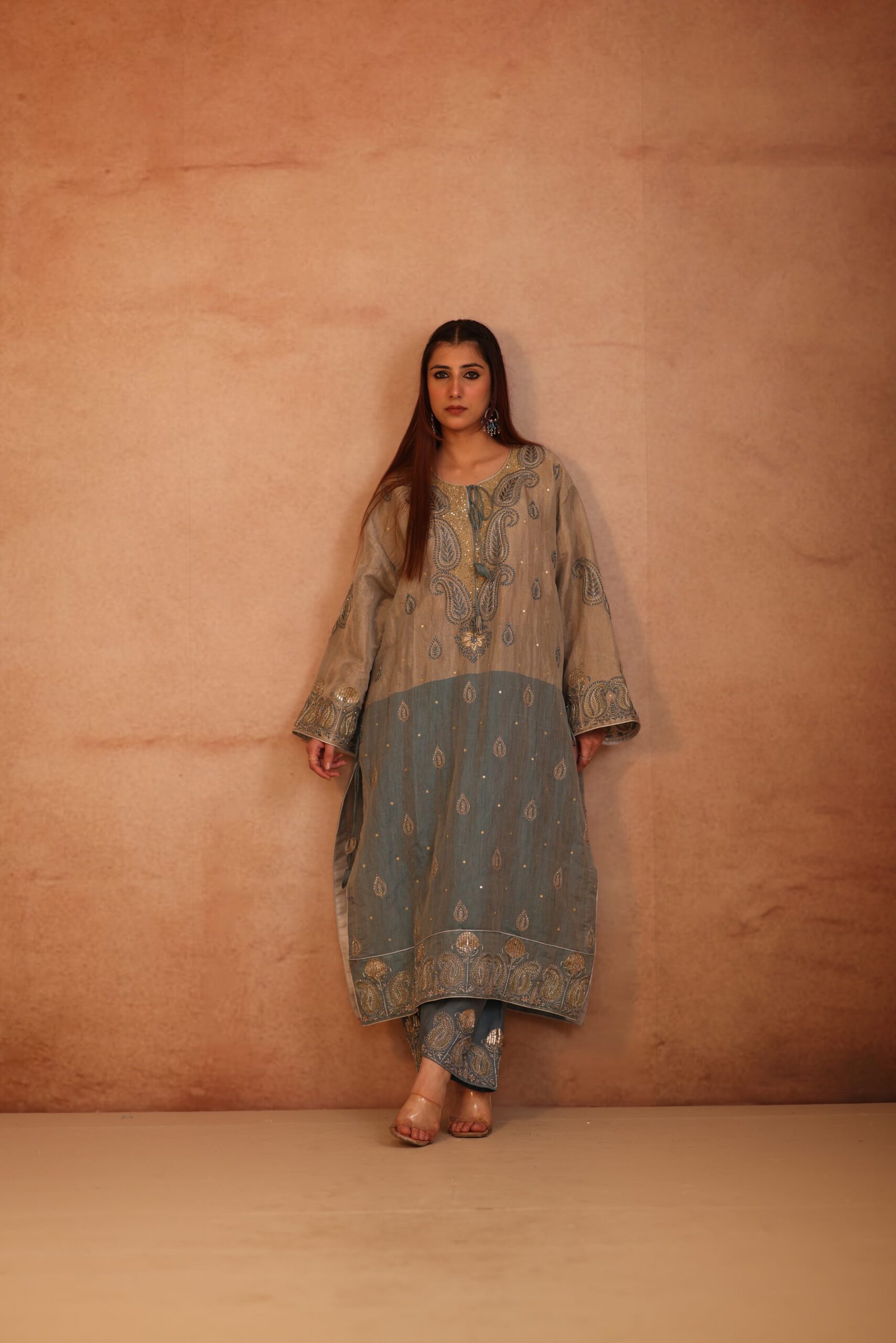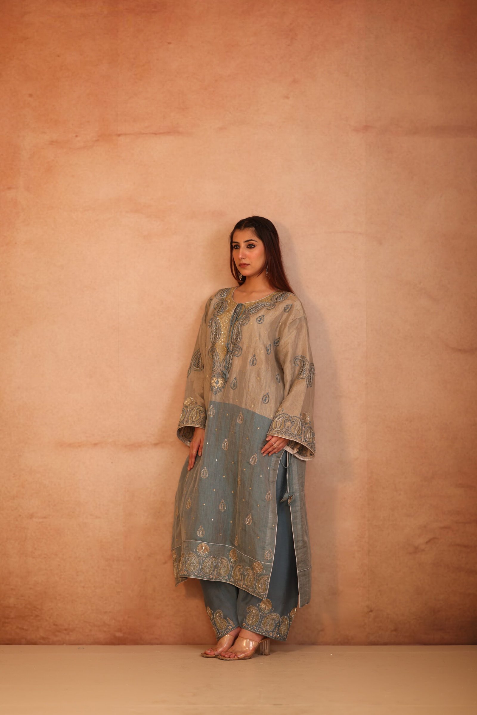 Inspired by timeless Pakistani silhouettes, this handcrafted chikankari co-ord set reflects understated luxury. Designed in a soothing earthy blue tone, it features intricate hand embroidery and a fluid,relaxed drape.