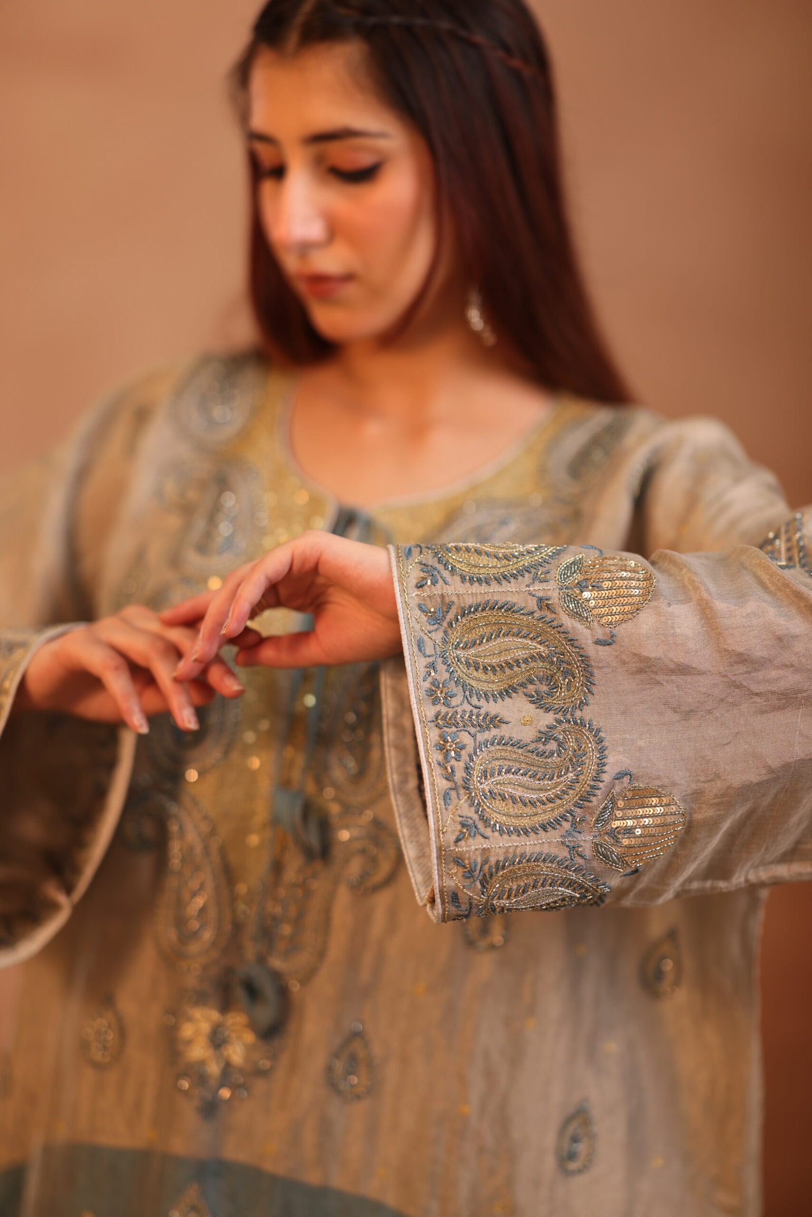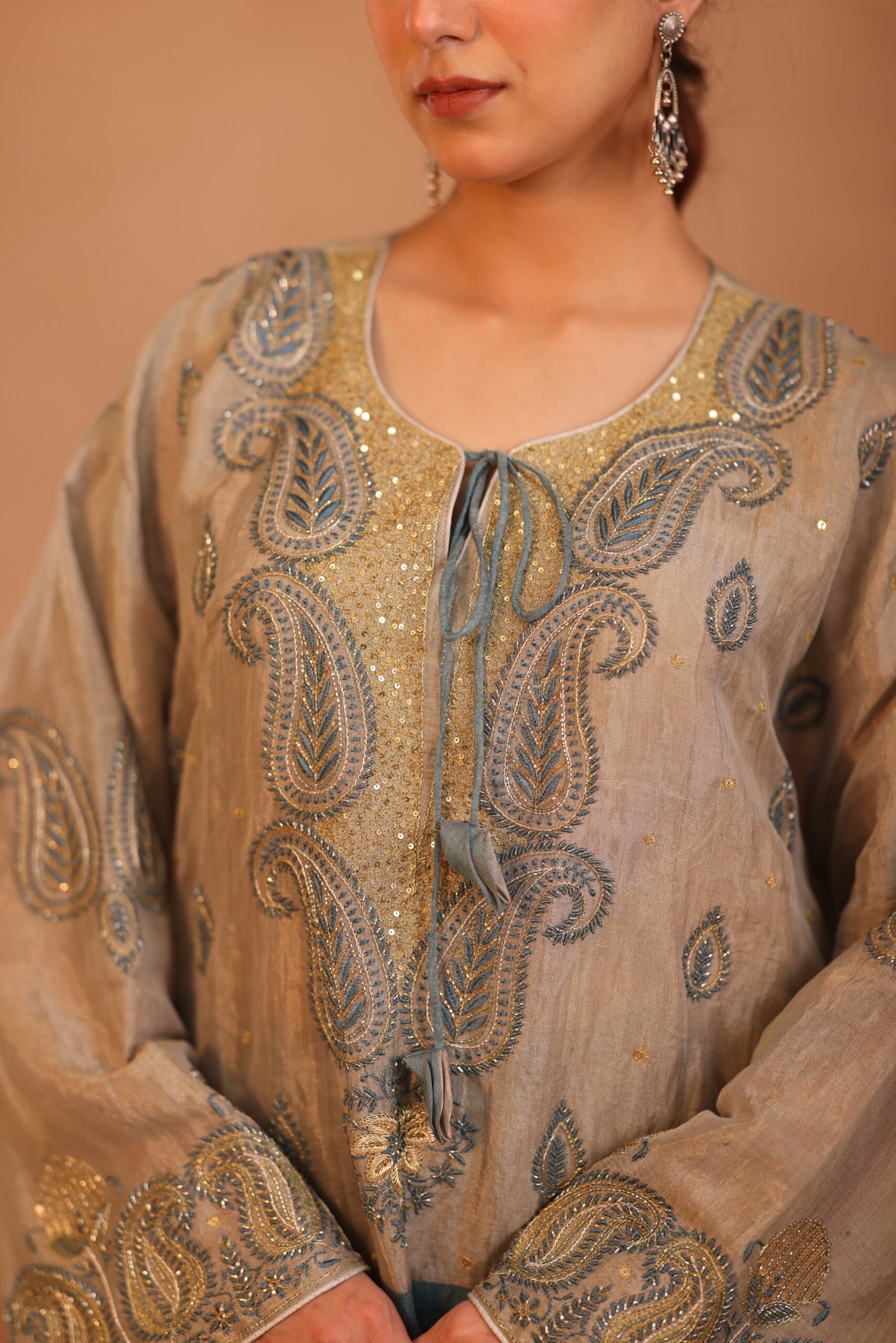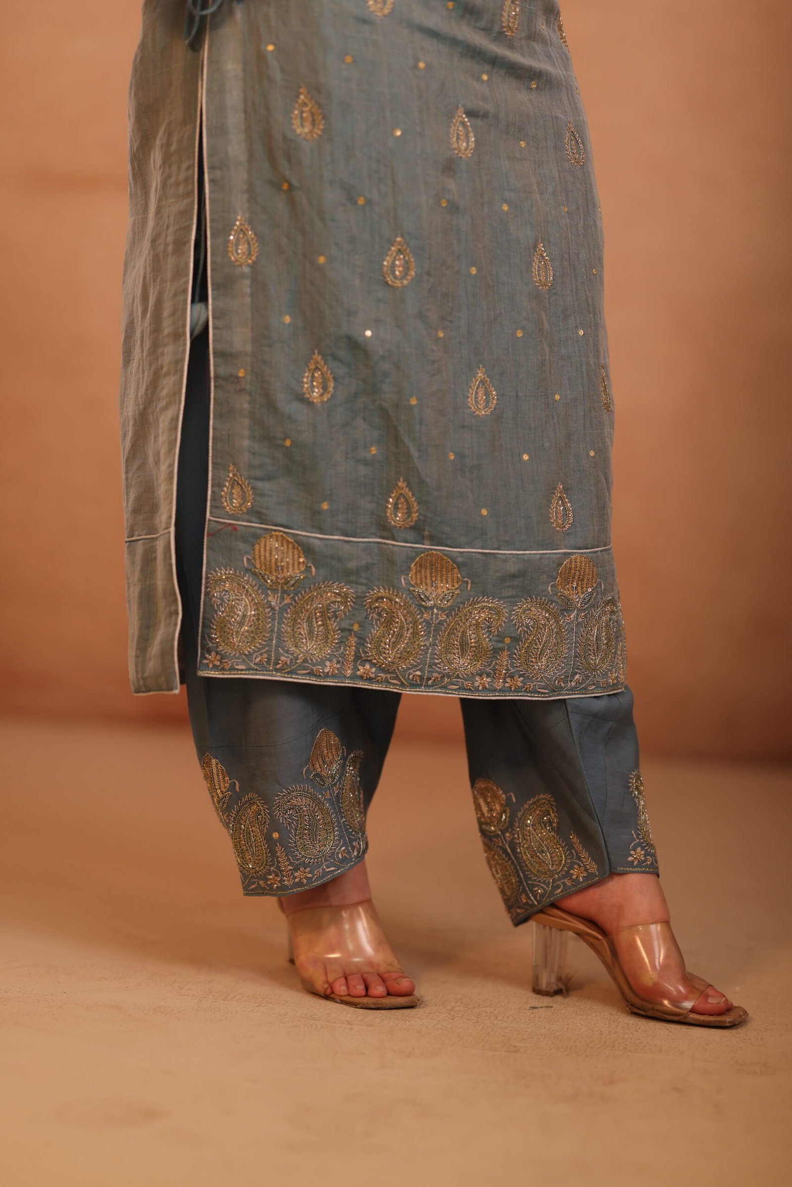 Inspired by timeless Pakistani silhouettes, this handcrafted chikankari co-ord set reflects understated luxury. Designed in a soothing earthy blue tone, it features intricate hand embroidery and a fluid,relaxed drape.