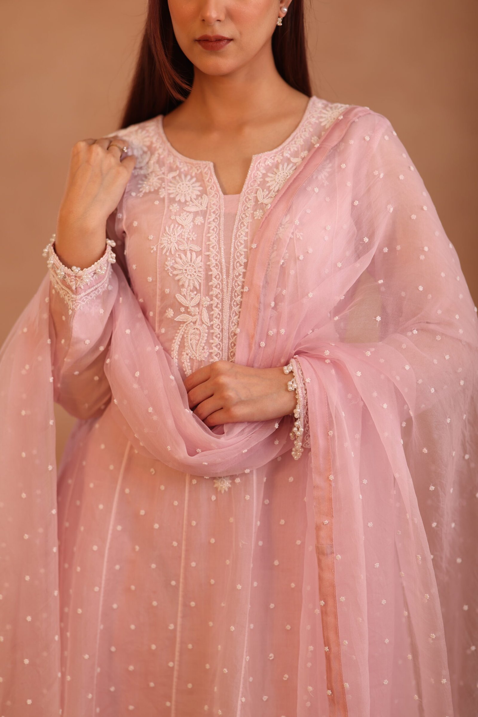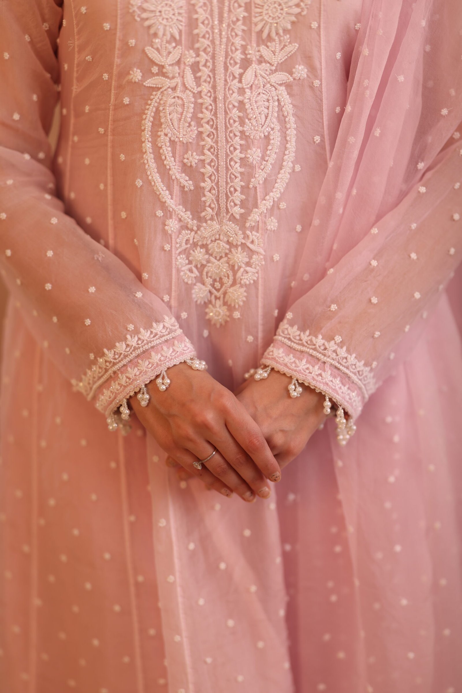 A vision of elegance, this pink organza Anarkali is adorned with delicate pearl work that adds a soft, luminous charm. The sheer, flowy fabric enhances its graceful silhouette, making it perfect for occasions that call for refined sophistication and feminine allure.